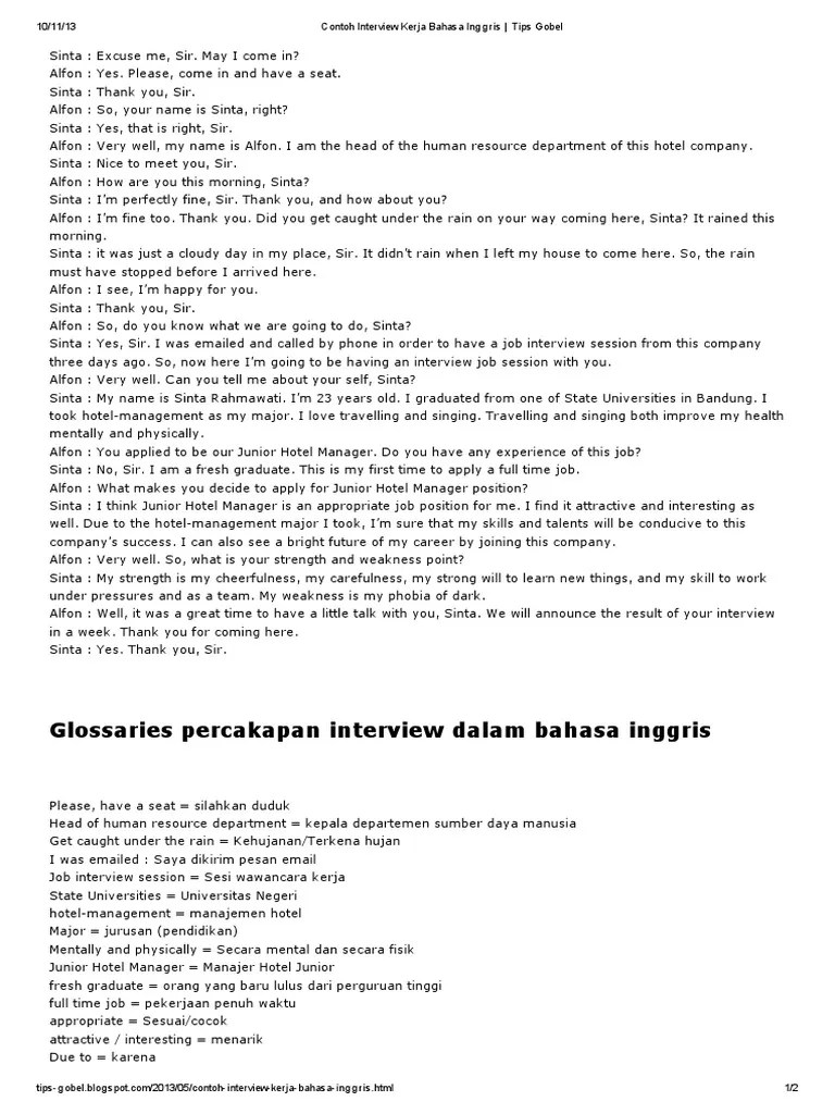 Interview merupakan sebuah dialog yang dilakukan . Perusahaan bonafit dan wawancara bahasa inggris, berikut ini contoh pertanyaan interview bahasa inggris beserta arti dan jawabannya. Arti dari contoh interview dalam bahasa inggris pertama. Contoh percakapan job interview dalam bahasa inggris 1: Bingung gimana menjawab pertanyaan yang .